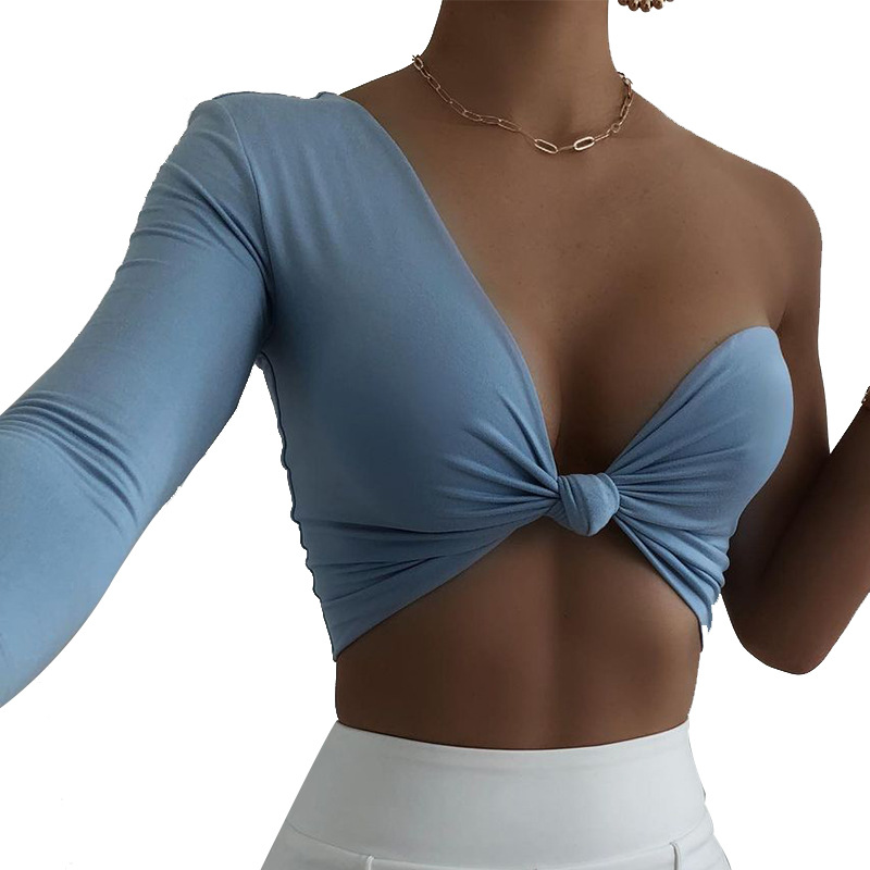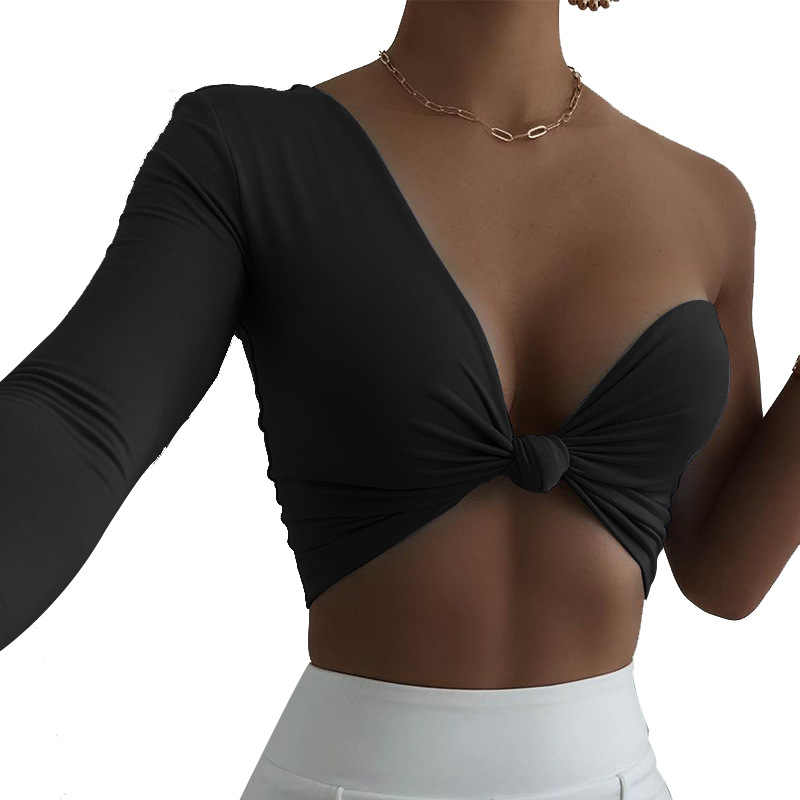 Solid Color Sexy Irregular One Shoulder Sleeve Slim Fit Wrap Top T-Shirt
